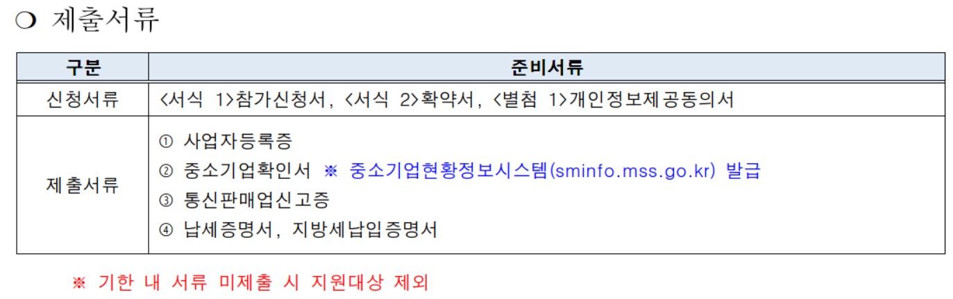 그외 제출 서류는 사업자등록증, 중소기업확인서 https://smino.mss.go.kr