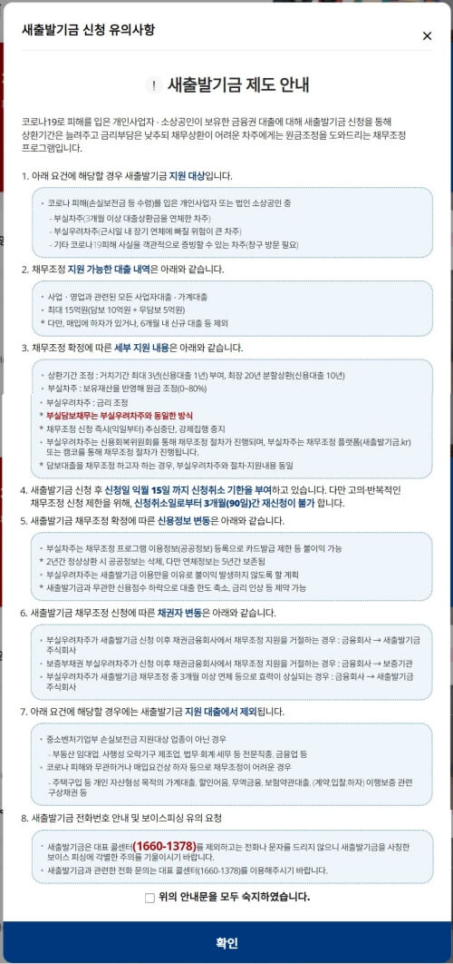 코로나19로 피해를 입은 개인사업자 및 소상공인이 보유한 금융권 대출에 대해 새출발기금 신청을 통해 상환기간은 늘려주고 금기부담은 낮추되 채무상환이 어려운 차주에게는 원금조정을 도와드리는 채무조정 프로그램입니다.